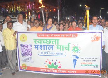 सागर/  सागर में भी नागरिकों एवं महिलाओं की सहभागिता स्वच्छता में सुनिश्चित करने हेतु महापौर श्रीमती संगीता सुशील तिवारी निगम आयुक्त चंद्रशेखर शुक्ला महापौर प्रतिनिधि श्री सुशील तिवारी स्वच्छता सभापति श्री शैलेश केसरवानी की उपस्थिति में स्वच्छता मशाल मार्च निकाला गया। मशाल मार्च पद्माकर स्कूल से प्रारंभ होकर तीन बत्ती स्थित गौर प्रतिमा पर समाप्त हुआ।