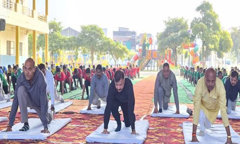 नरसिंहपुर जिले के राव रुक्मणीदेवी पब्लिक स्कूल में आयोजित सूर्य नमस्कार कार्यक्रम में हुए शामिल