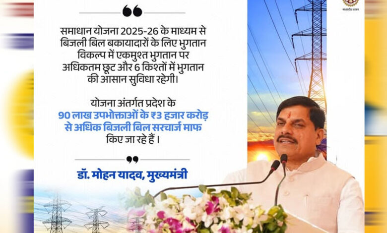 समाधान योजना 2025-26 का उद्देश्य 3 माह से अधिक अवधि के उपभोक्ताओं को बकाया विलंबित भुगतान के सरचार्ज पर छूट प्रदान करना है। यह योजना जल्दी आएं, एकमुश्‍त भुगतान कर ज्यादा लाभ पाएं के सिद्धांत पर आधारित है। इस योजना में उपभोक्ता को प्रथम चरण में एकमुश्‍त भुगतान करने पर सबसे अधिक लाभ हो रहा है जबकि द्वितीय चरण के दौरान छूट का प्रतिशत क्रमशः कुछ कम हो जाएगा। यह योजना दो चरणों में प्रारंभ होकर प्रथम चरण की शुरुआत 3 नवंबर 2025 से हुई जो कि 31 जनवरी 2026 तक चलेगी। इसमें बकाया बिल एकमुश्‍त जमा करने पर 60 से लेकर 100 प्रतिशत तक सरचार्ज माफ किया जा रहा। इसके बाद द्वितीय और अंतिम चरण शुरू होगा जो कि 01 फरवरी से 28 फरवरी 2026 तक चलेगा। दूसरे चरण में 50 से 90 फ़ीसदी तक सरचार्ज माफ किया जाएगा। समाधान योजना 2025-26 का लाभ उठाने के लिए उपभोक्ताओं को कंपनी के ऐप एवं कॉमन सर्विस सेंटर (सीएससी) तथा एमपी ऑनलाइन पर भी पंजीयन की सुविधा उपलब्‍ध है। पंजीयन के दौरान अलग-अलग उपभोक्ता श्रेणी के लिए पंजीयन राशि निर्धारित की गई है। घरेलू एवं कृषि उपभोक्ता कुल बकाया राशि का 10 प्रतिशत तथा गैर घरेलू और औद्योगिक उपभोक्ता कुल बकाया राशि का 25 प्रतिशत भुगतान कर पंजीयन कराकर योजना में शामिल होकर लाभ उठा सकते हैं। विस्तृत विवरण तीनों कंपनियों की वेबसाइटों पर भी देखा जा सकता है। साथ ही विद्युत वितरण केंद्र में पहुंचकर भी योजना के संबंध में जानकारी ले सकते हैं।