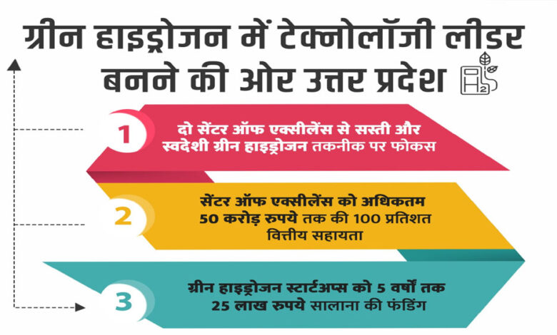 उतर प्रदेश सरकार ने ग्रीन हाइड्रोजन के लिए एक्शन प्लान पर काम शुरू कर दिया है। मुख्यमंत्री योगी आदित्यनाथ के नेतृत्व में प्रदेश सरकार ग्रीन हाइड्रोजन पालिसी के अंतर्गत शोध (रिसर्च), नवाचार (इनोवेशन) और स्टार्टअप इकोसिस्टम को नयी धार देने जा रही है। इस रणनीति के तहत प्रदेश में दो सेंटर ऑफ़ एक्सीलेंस स्थापित किये जायेंगे और ग्रीन हाइड्रोजन से जुड़े स्टार्टअप्स को 05 सालों तक वित्तीय सहायता दी जाएगी। सरकार का लक्ष्य है कि ग्रीन हाइड्रोजन की लागत घटाकर उत्तर प्रदेश को देश की ग्रीन एनर्जी टेक्नोलॉजी का प्रमुख केंद्र बनाया जाए।